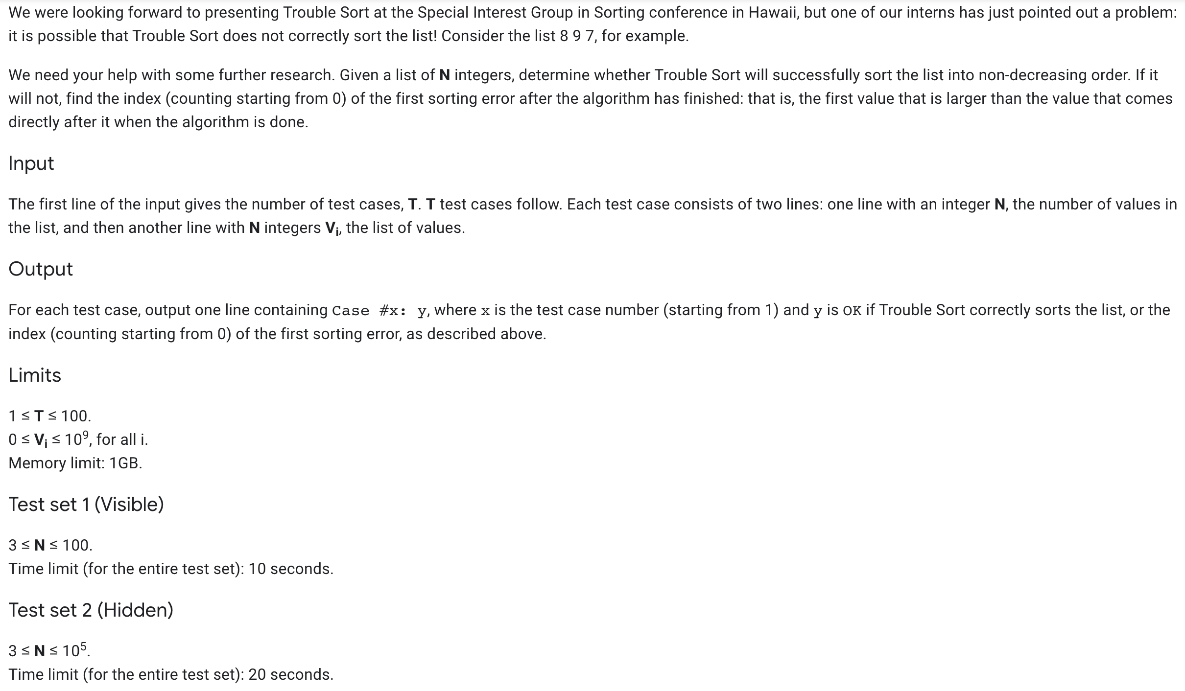 문제에서 주어진 트리플 버블 정렬 코드를 넣고 정렬된 배열인 v를 차례로 돌면서 검사하면 Test Set 2에서 시간초과가 발생한다.