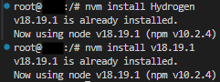 이 중 원하는 버전을 선택해 다음 커맨드 중 하나로 설치할 수 있다. 이미 깔려있는 node v18.19.1을 예시로 사용해보겠다.
