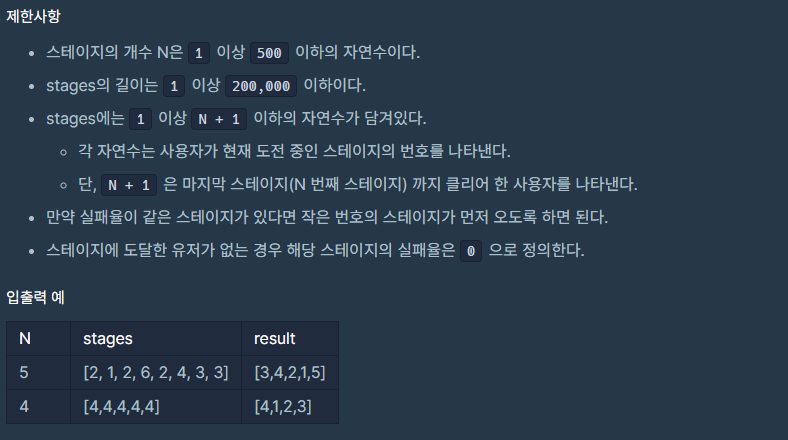 - stages에 실패한 스테이지들이 적혀있다. 1스테이지에서 실패한 사람은 2스테이지부터는 도달하지 못한 것.