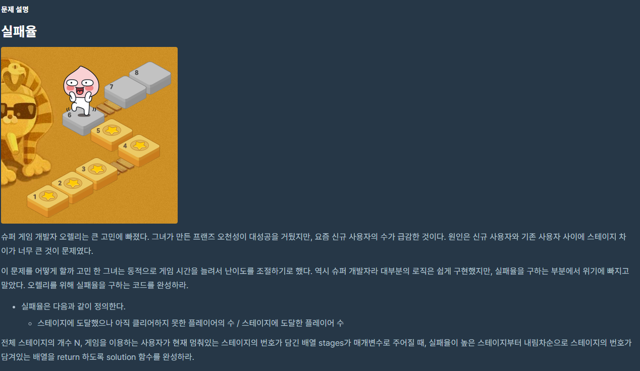 - 해당 스테이지에 도달한 플레이어 수가 0일 때는 0으로 나눌 수 없으므로, 예외처리해서 failure_rate에 직접 0을 넣어줘야 했다.