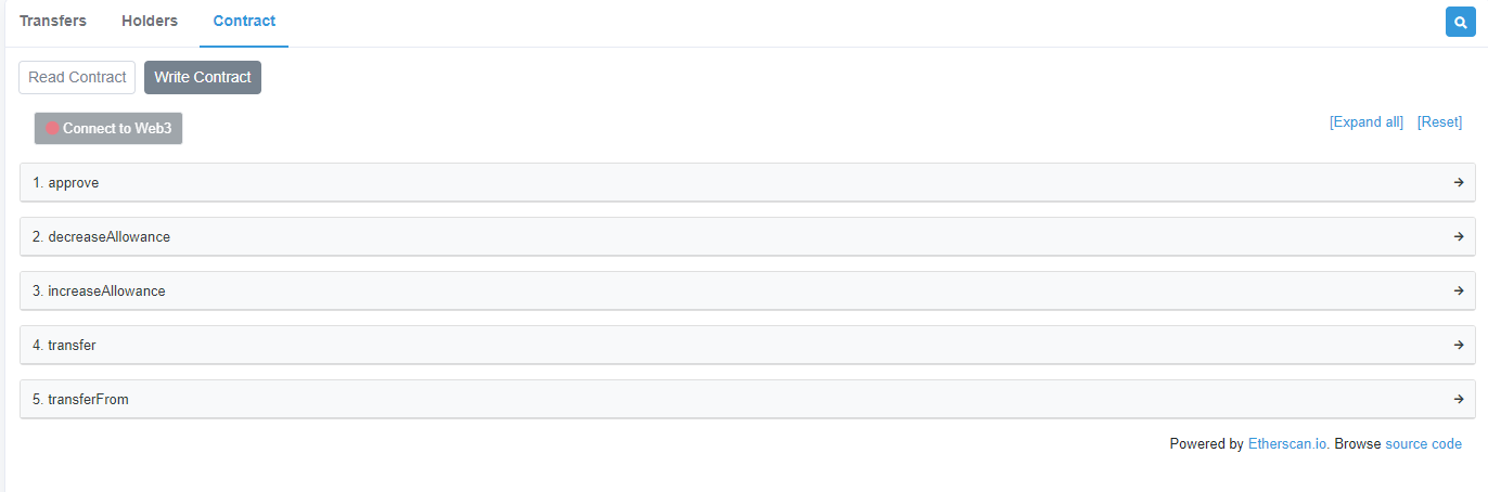 토큰 페이지의 contract 탭을 누르면 코드에서 설정한 것을 읽어오는 read contract와 전송 등 동작을 수행하는 write contract 모두 contract 소스코드를 verify 하기를 요구한다.