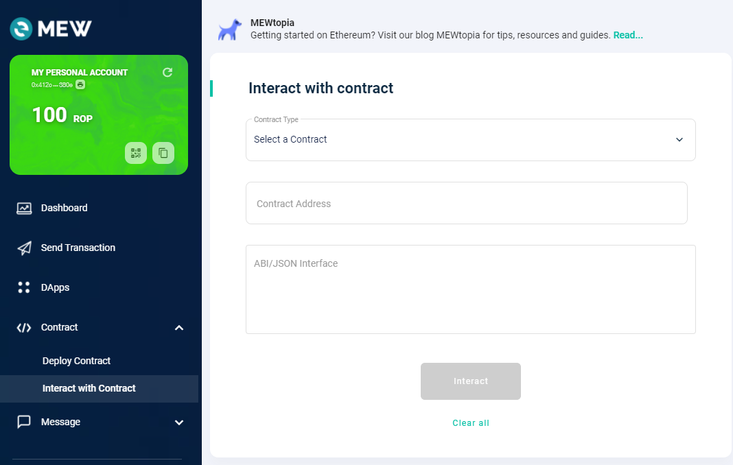 좌측의 contract 에서 Interact with Contract를 선택한다.
