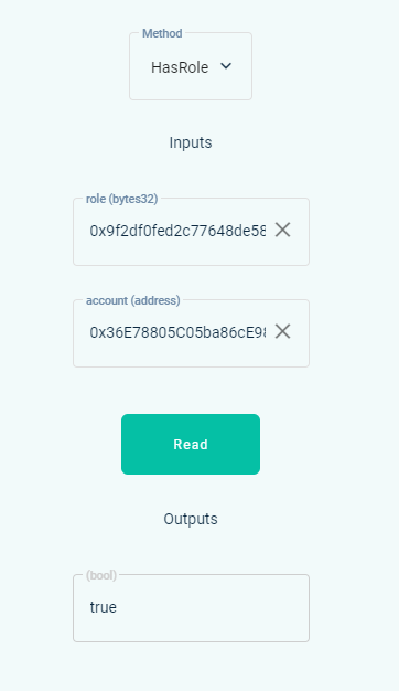 나온 값을 더블클릭해 복사하고, hasrole을 선택해 role 부분에 붙여넣고, 2100만개 토큰을 갖고 있는 지갑 주소를 복사해 붙여넣어 mint 권한이 있는지 검사해보자.