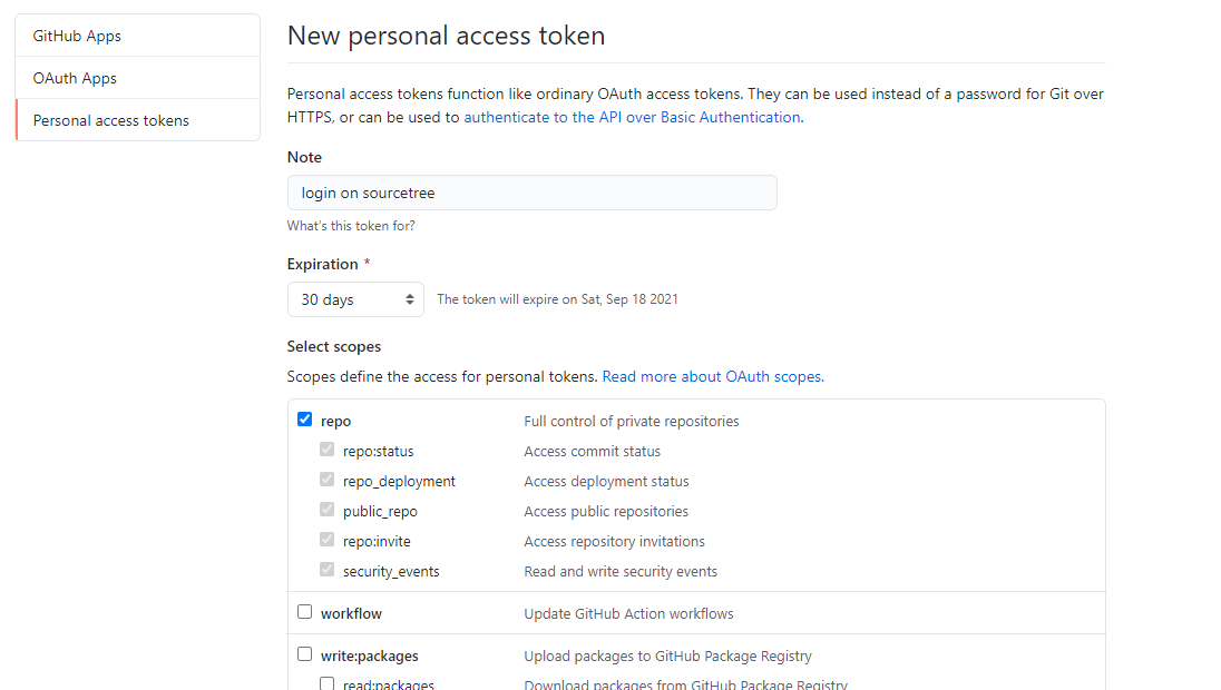 토큰 생성의 목적을 쓰고, 토큰 만료일을 설정한 후 repo를 체크 후 가장 하단에 있는 Generate token을 클릭
