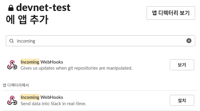 incoming을 입력하면 incoming webhooks가 여러개 나오는데, 밑으로 내려서 앱 디렉터리의 incoming webhooks 설치를 누르고 slack에 추가한다.