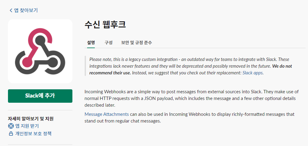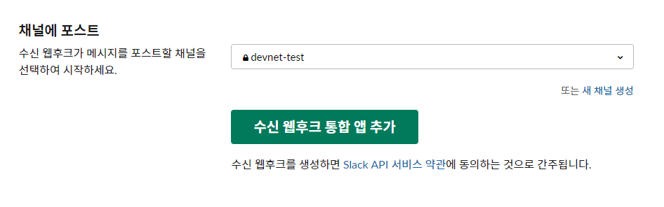 포스트할 채널을 선택한 뒤 수신 웹후크 통합 앱 추가를 누른다.