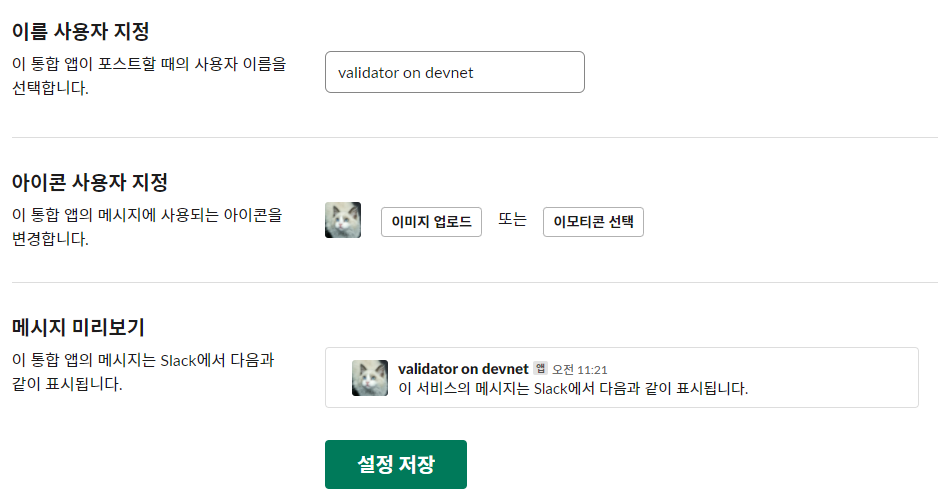 기본 설정은 여기서 할 수 있다. 나는 자동으로 보내지는 메시지는 위와 같은 이름과 이미지로 보내지게끔 해두었다.