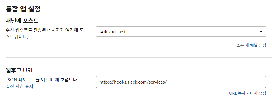 설정 지침에서 스크롤을 내려보면 통합 앱 설정 섹션이 있다. 생성된 웹훅 url(뒷부분은 가려놓음)은 여기서 복사해 사용하면 된다.