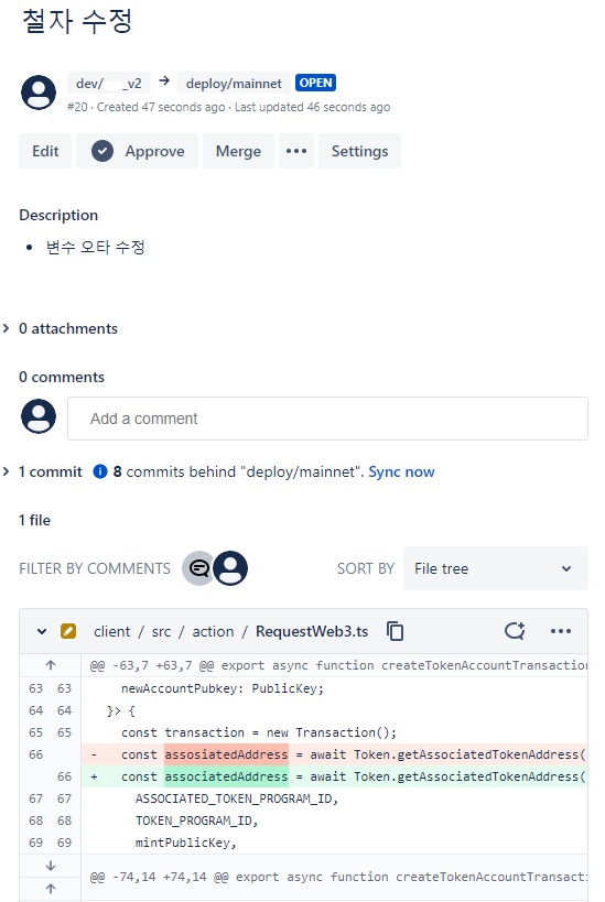 - reviewer 를 추가하지 않으면 나 혼자 코드 변경사항을 확인하고 merge 할 수 있다.