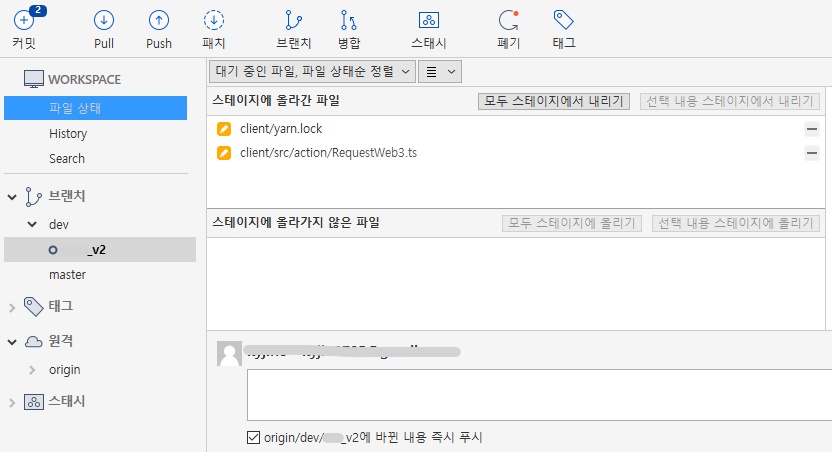 반영할 브랜치, 즉 왼쪽에서 푸시 표시가 생긴 브랜치(여기서는 테스트 브랜치)만 선택해 푸시해주자.