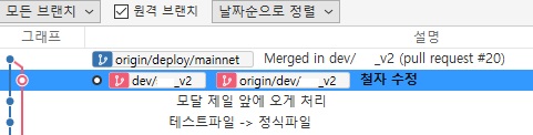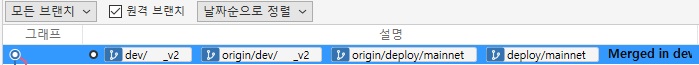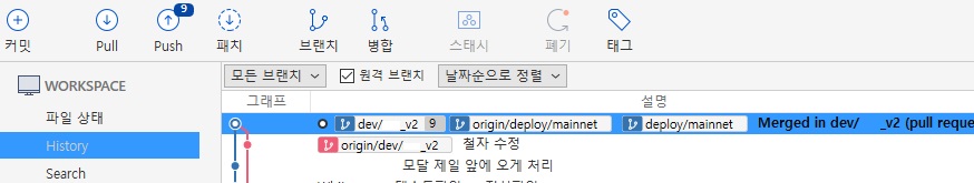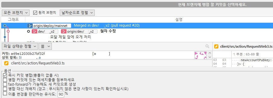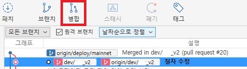 2. Destination 브랜치의 최신 작업을 선택한 상태에서 병합 버튼을 누르고, 반영하려는 Source 브랜치의 최신 작업을 선택해서 병합한다.