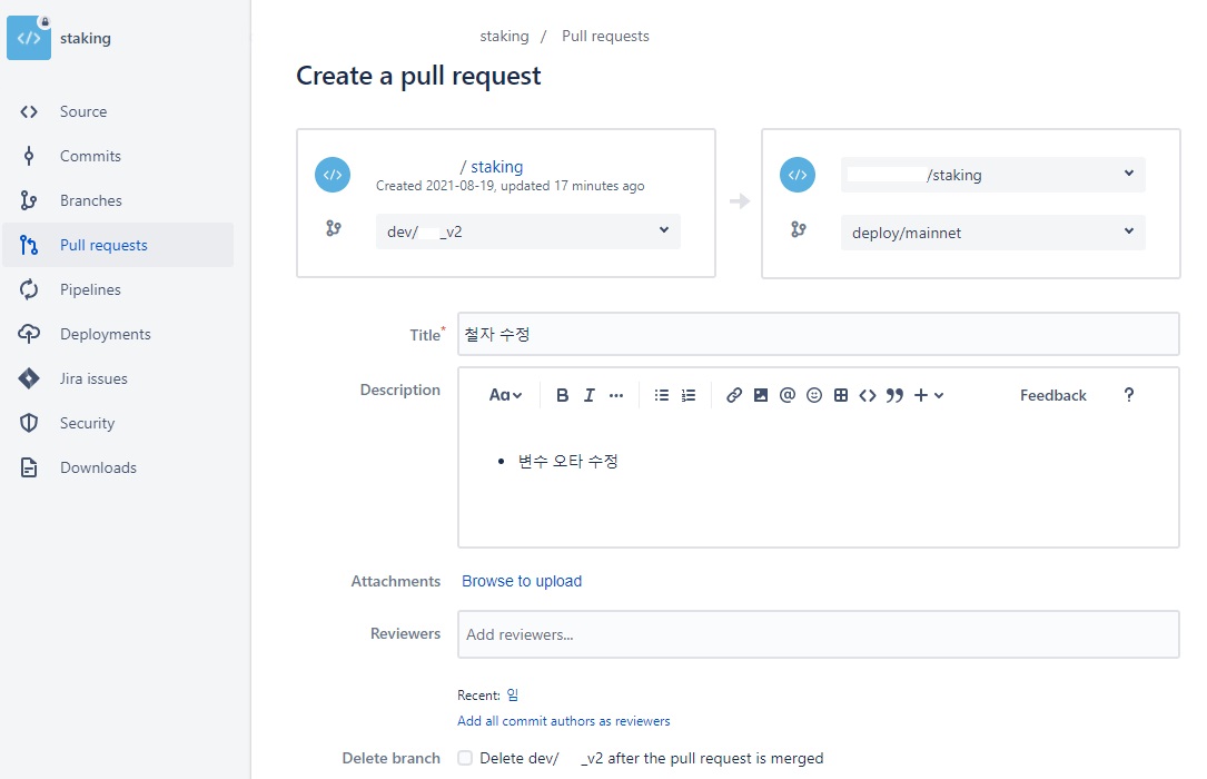 Bitbucket에서 협업 작업을 하면 pull request를 이용해 그런 일을 조금이나마 방지할 수 있다.