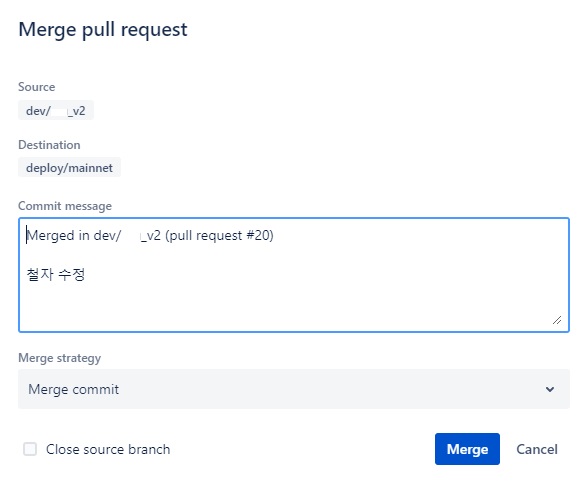 이 때 충돌이 있으면 bitbucket에서 충돌을 해결해야 한다고 뜨면서 Merge가 활성화되지 않는다. 이 경우의 해결방법은 아래 '충돌이 있는 병합'에 적어두었다.