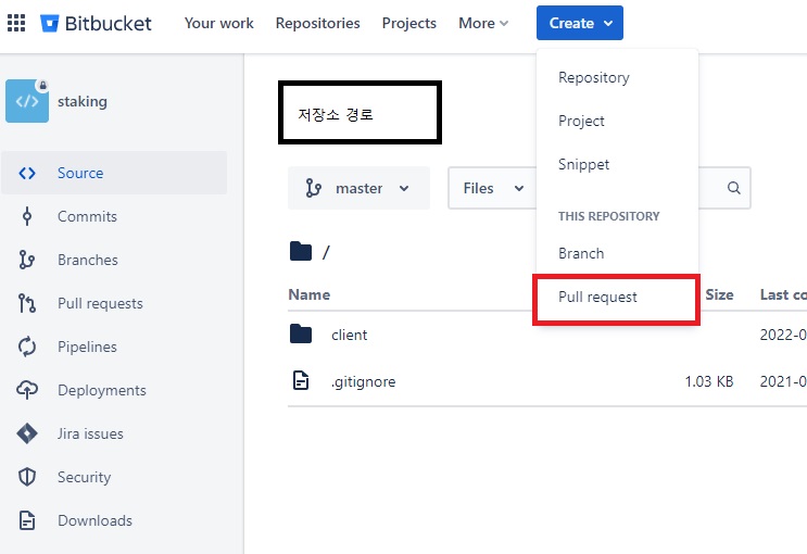 2. 코드와 연동해둔 Bitbucket 의 저장소 페이지로 가서 상단의 Create > pull request 를 누른다.