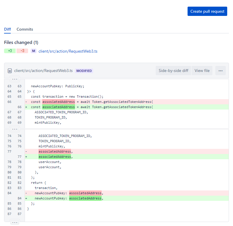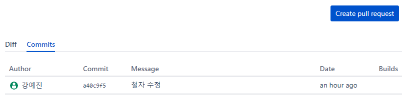 하단에 Create pull request 를 누르면 pull request가 생성된다. 그 하단에서는 코드 변동사항(Diff)과 커밋내용, 커밋코드(Commits) 등을 확인할 수 있다.